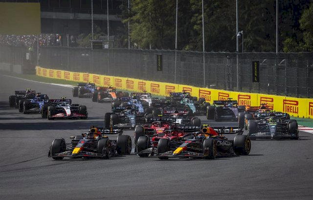 El de Red Bull atacó de salida partiendo tercero por detrás de los Ferrari y tomó la cabeza para empezar, con la desgracia para un Sergio Pérez que se tuvo que retirar ante su público en la primera curva.